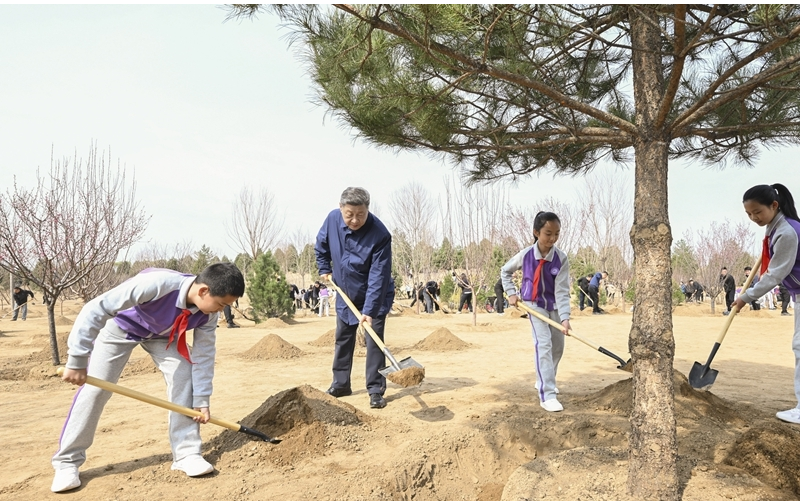 挥锹铲土、培土围堰、提水浇灌……习近平接连种下油松、北京牡丹、榆叶梅、杜仲、元宝枫等多棵树苗。他一边植树,一边询问孩子们的学习生活、劳动锻炼和参加植树情况。习近平强调,青少年像小树苗一样充满活力和希望,要从小树立远大志向,爱知识、爱劳动、爱自然,德智体美劳全面发展,努力成长为栋梁之材。现场气氛热烈,一派繁忙景象。