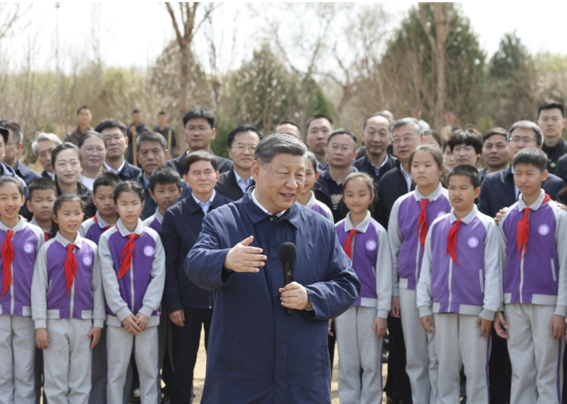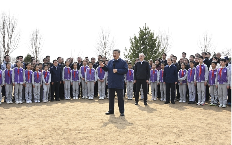 3月30日,党和国家领导人习近平、李强、赵乐际、王沪宁、蔡奇、丁薛祥、李希等来到北京市昌平区百善镇参加首都义务植树活动。这是习近平同在场的干部群众、少先队员亲切交谈。新华社记者 燕雁 摄