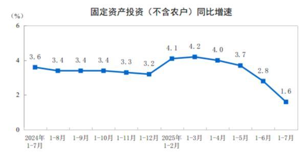 国家统计局15日发布7月国民经济运行情况:2025年1—7月份,全国固定资产投资(不含农户)288229亿元,同比增长1.6%(按可比口径计算,详见附注7)。其中,民间固定资产投资同比下降1.5%。从环比看,7月份固定资产投资(不含农户)下降0.63%。