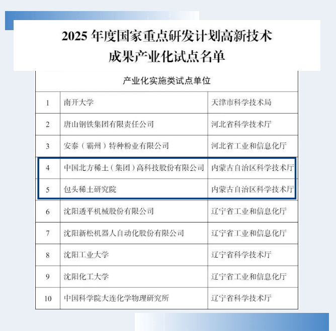 日前,工业和信息化部公布2025年度国家重点研发计划高新技术成果产业化试点名单,包钢(集团)公司所属北方稀土、包头稀土研究院两家单位入选产业化实施类试点单位。