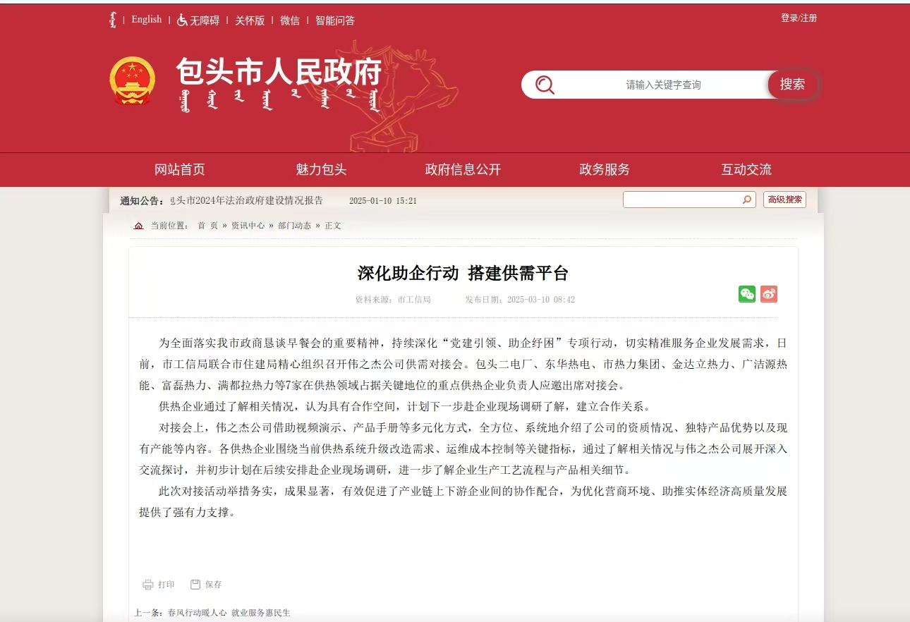 对接会上,伟之杰公司借助视频演示、产品手册等多元化方式,全方位、系统地介绍了公司的资质情况、独特产品优势以及现有产能等内容。各供热企业围绕当前供热系统升级改造需求、运维成本控制等关键指标,通过了解相关情况与伟之杰公司展开深入交流探讨,并初步计划在后续安排赴企业现场调研,进一步了解企业生产工艺流程与产品相关细节。