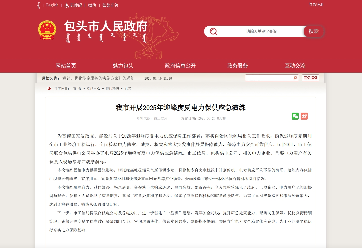 为贯彻国家发改委、能源局关于2025年迎峰度夏电力供应保障工作部署,落实自治区能源局相关工作要求,确保迎峰度夏期间全市工业经济平稳运行,全面检验电力防灾、减灾、救灾和重大突发事件处置保障能力,保障电力安全可靠供应,6月20日,市工信局联合包头供电公司举办了电网2025年迎峰度夏电力保供应急演练。市工信局、包头供电公司、相关电力企业、重要电力用户有关负责人现场参与并观摩演练。