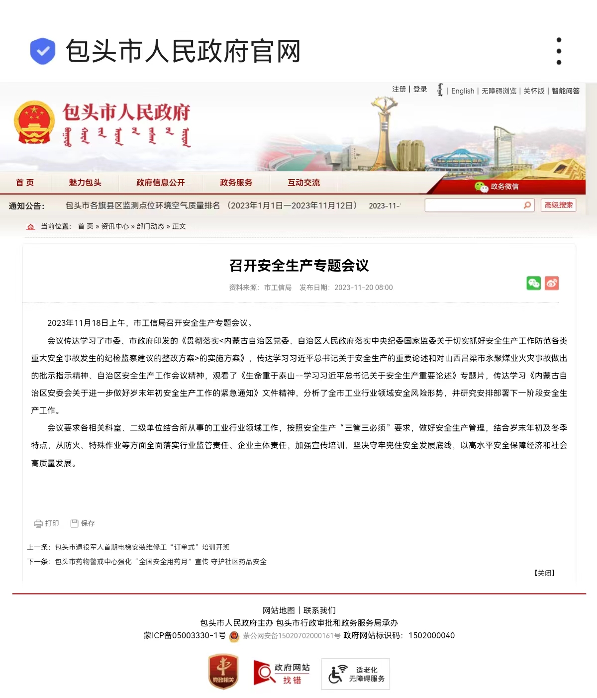 会议传达学习了市委、市政府印发的《贯彻落实<内蒙古自治区党委、自治区人民政府落实中央纪委国家监委关于切实抓好安全生产工作防范各类重大安全事故发生的纪检监察建议的整改方案>的实施方案》,传达学习习近平总书记关于安全生产的重要论述和对山西吕梁市永聚煤业火灾事故做出的批示指示精神、自治区安全生产工作会议精神,观看了《生命重于泰山--学习习近平总书记关于安全生产重要论述》专题片,传达学习《内蒙古自治区安委会关于进一步做好岁末年初安全生产工作的紧急通知》文件精神,分析了全市工业行业领域安全风险形势,并研究安排部署下一阶段安全生产工作。