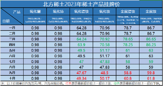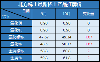 10月7日,北方稀土公布10月挂牌价。其中,氧化镨钕上涨1.67万元/吨,报49.34万元/吨;氧化钕上涨1.67万元/吨,报50.17万元/吨;金属镨钕上涨2万元/吨,报60.8万元/吨;金属钕上涨2万元/吨,报61.8万元/吨。
