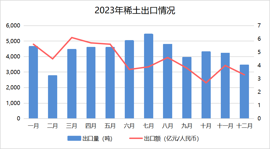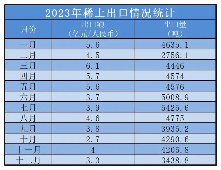 2023年全年累计出口稀土商品52306.5吨,同比增长7.3%,累计出口额达53.4亿元人民币,同比减少24.5%。
