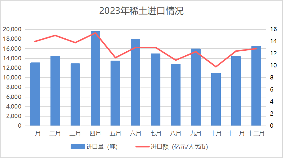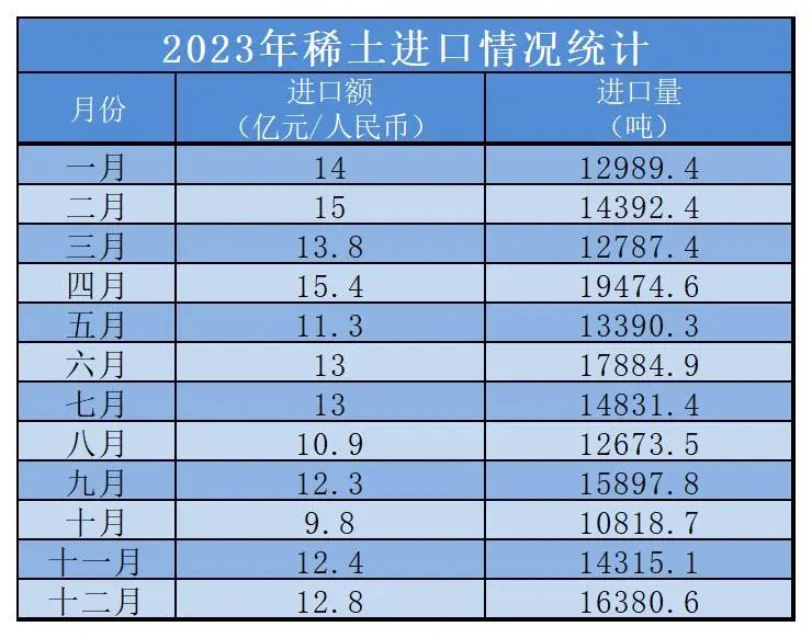 12月出口稀土商品3438.8吨,环比减少18.2%,出口额达3.3亿元人民币,环比减少17.5%。 12月进口稀土商品16380.6吨,环比增长14.4%,进口金额达9.8亿元人民币,环比增长3.2%。至此,2023年全年稀土进出口数据全部公布,数量情况好于2022年。