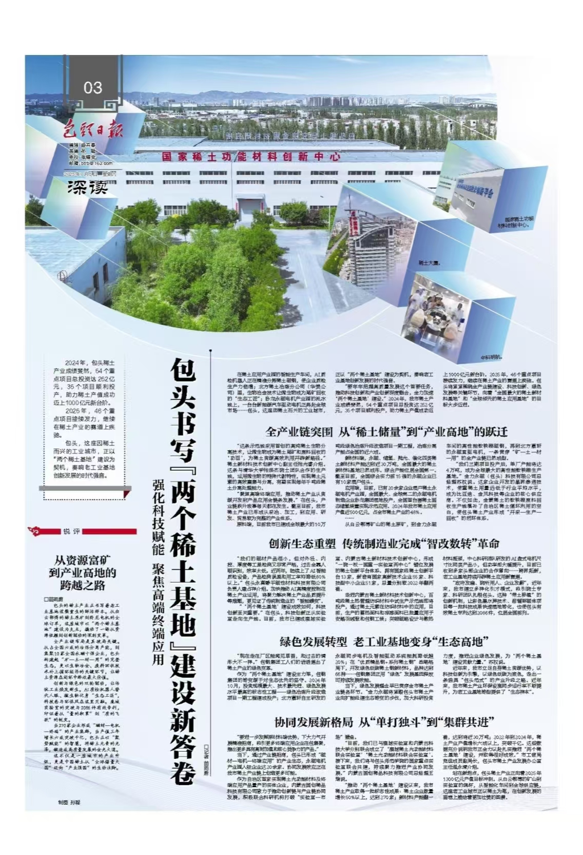 当下,绿色发展理念早已贯穿全市稀土产业链各环节。“金力永磁将紧跟包头市稀土产业向扩能级建生态转变的步伐,加大科研投资力度,推进企业绿色发展,为‘两个稀土基地’建设贡献力量。”苏权说。