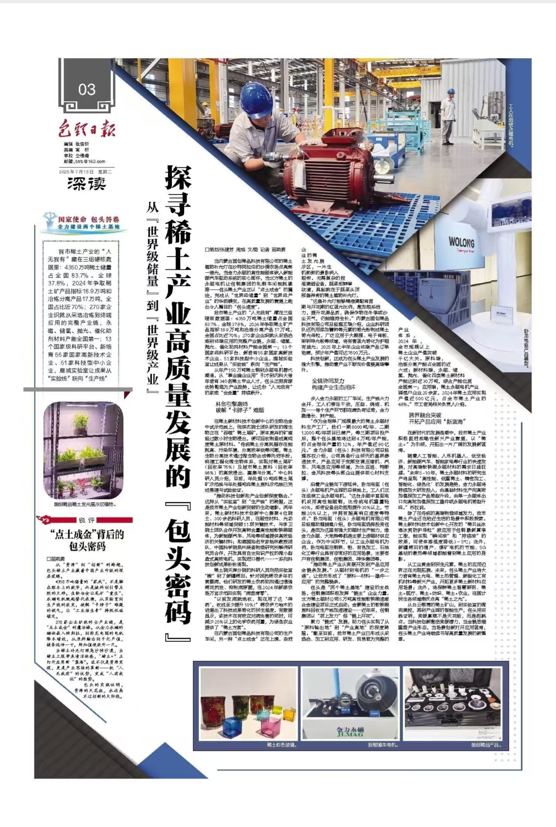 当内蒙古国创稀品科技有限公司的稀土植物补光灯在沙特阿拉伯的沙漠农场点亮第一缕光,当金力永磁的高性能磁体嵌入新能源汽车驱动系统的核心部件,当北方稀土的永磁电机让包钢集团的轧钢车间能耗骤降——包头稀土产业正以“点土成金”的魔法,完成从“世界级储量”到“世界级产业”的华丽蝶变,在高质量发展的赛道上跑出令人瞩目的“包头速度”。
