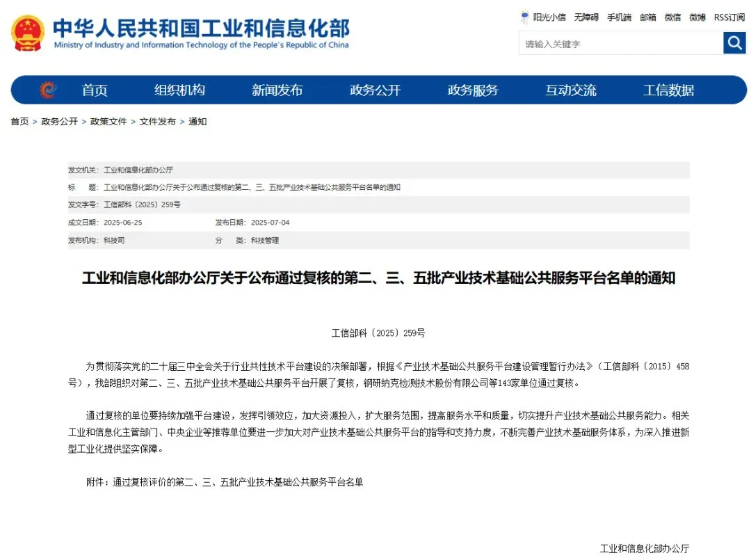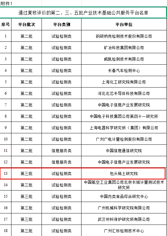 近日,国家工业和信息化部公布通过复核的第二、三、五批产业技术基础公共服务平台名单,稀土院位列其中。