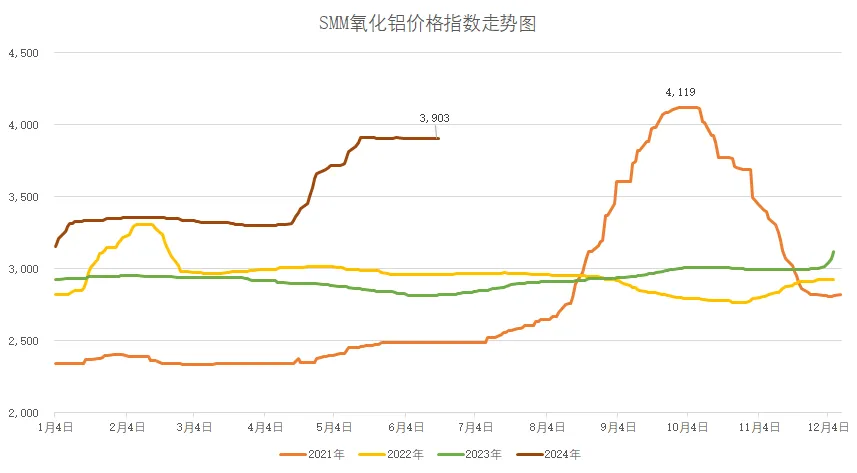 回顾2024年上半年,氧化铝价格整体呈现阶梯式上行走势,一季度价格走势相较平稳,二季度大幅上探后持稳运行。2024年上半年最高价3,908元/吨(2024年5月中旬),最低价格3154元/吨(2024年年初),高低价差754元/吨。