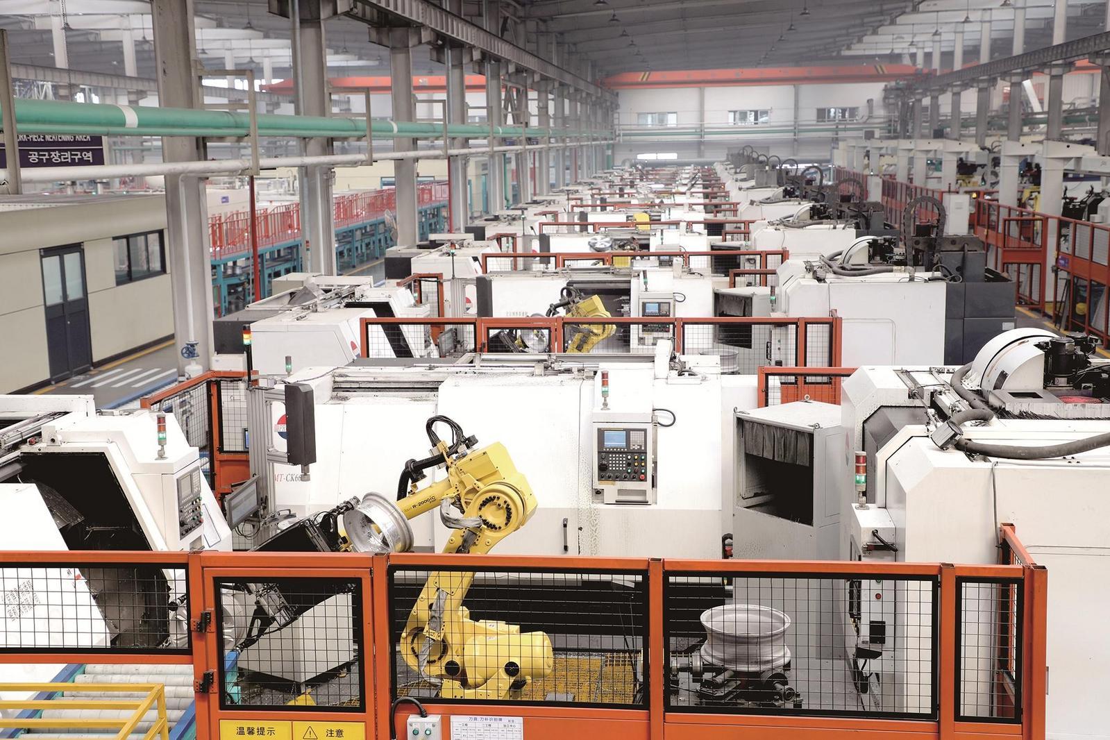 清晨七点,包头盛泰汽车零部件制造有限公司150万只乘用车轮智能生产车间的机械臂快速挥舞着让人眼花缭乱。机械工程师戴着安全帽,盯着中控屏上跳动的数据,指尖在操作面板上快速滑动——这条刚投产半年的生产线,正为某新能源车企赶制一批精细的铝合金轮毂产品。