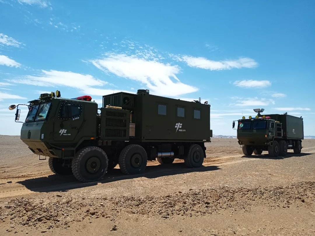 返回舱搜索回收任务中的两台北奔重型高机动通用战术车辆为双前桥全时全驱越野车,具有高承载能力、高机动能力、高生存能力和高信息化水平,安全可靠,性能优越,有效保障任务过程中驾乘人员和装备的安全。