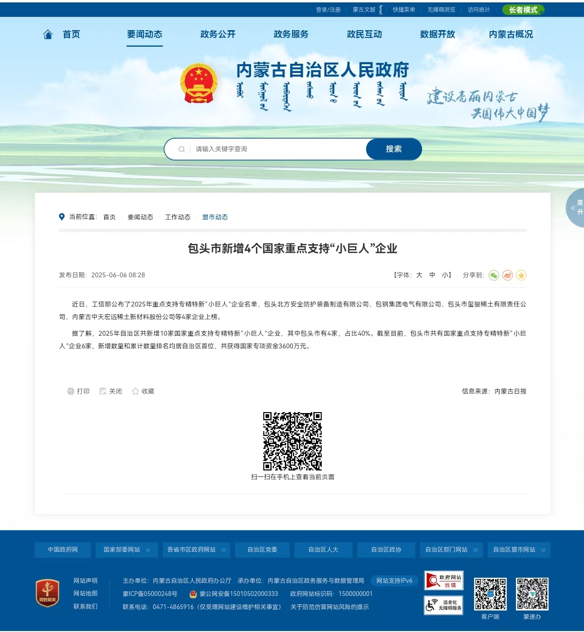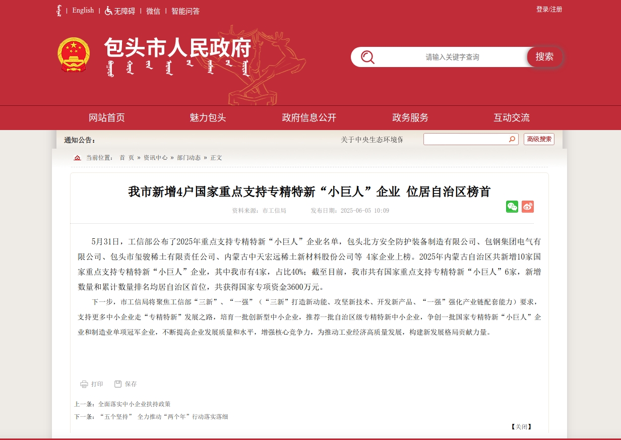 5月31日,国家工信部公布了2025年重点支持专精特新“小巨人”企业名单,包头北方安全防护装备制造有限公司、包钢集团电气有限公司、包头市玺骏稀土有限责任公司、内蒙古中天宏远稀土新材料股份公司等 4家企业上榜。2025年内蒙古自治区共新增10家国家重点支持专精特新“小巨人”企业,其中我市有4家,占比40%;截至目前,我市共有国家重点支持专精特新“小巨人”6家,新增数量和累计数量排名均居自治区首位,共获得国家专项资金3600万元。