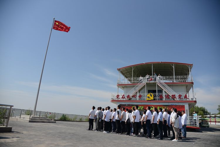 在南海湿地公园红色收藏馆外,全体人员队列整齐,升旗仪式正式开始,伴随着《义勇军进行曲》慷慨激昂的旋律,鲜艳的五星红旗冉冉升起。全体党员干部肃然起敬,面向国旗行注目礼,共同祝福伟大祖国更加繁荣昌盛。