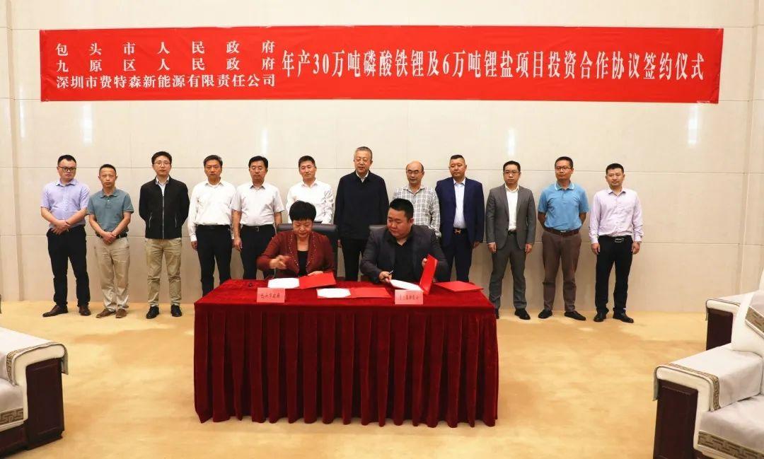 8月30日,包头市人民政府、九原区人民政府与深圳市费特森新能源有限责任公司举行年产30万吨磷酸铁锂项目及年产6万吨锂盐项目投资合作协议签约仪式。市委副书记、市长张锐,市政府党组成员王秀莲,市政府秘书长汪占元,九原区委书记刘俊义,九原区委副书记、区长刘小平,市工信局局长强嶽,市发改委副主任施春华及相关部门负责人参加签约仪式。