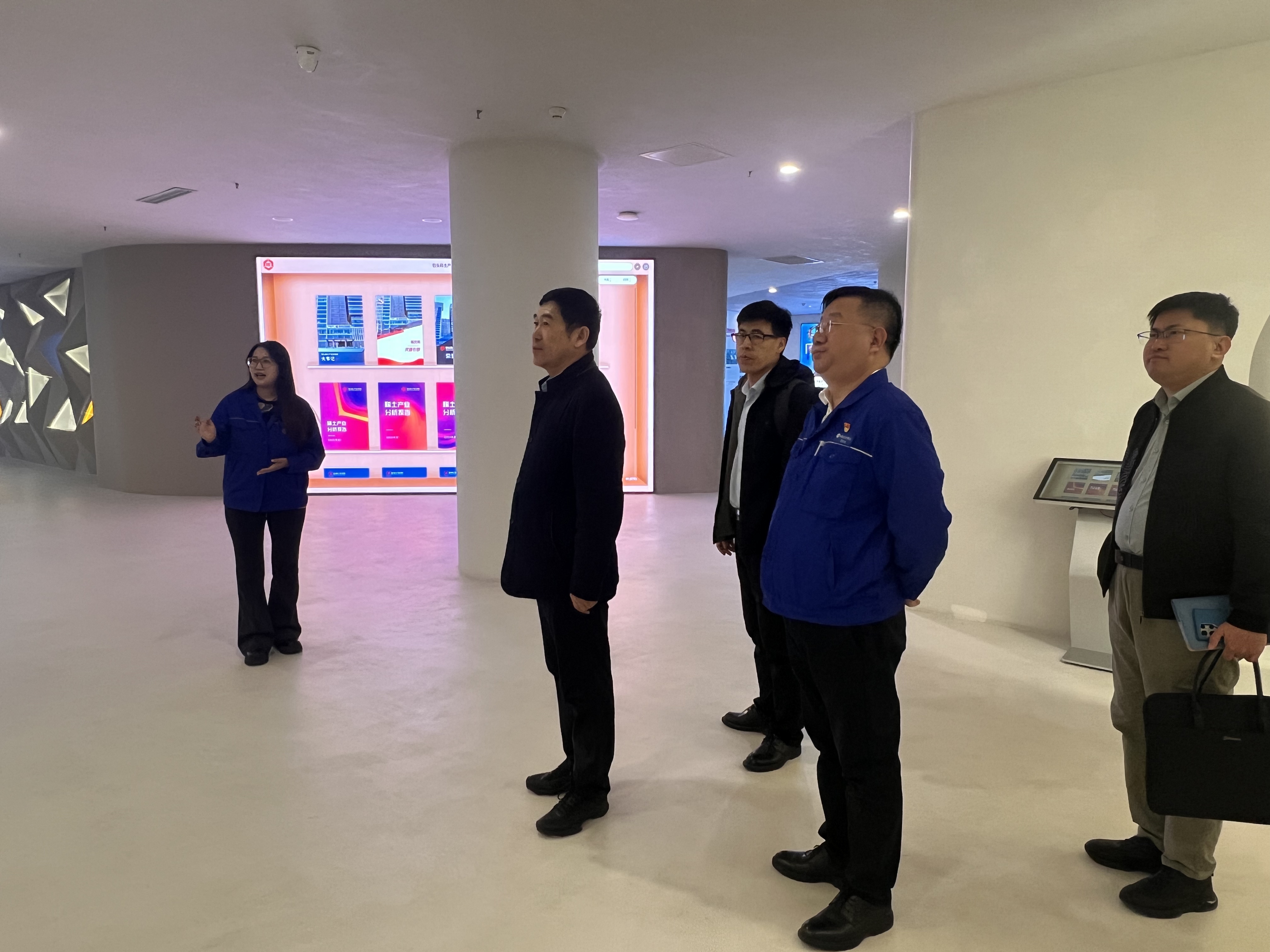 调研组实地参观了稀交所交易大厅、数据监测中心,详细了解了稀交所的运营模式、交易规模及服务功能。座谈会上,稀交所相关负责人重点介绍了稀土产品的交易模式、每日价格报价的创新成果、工作亮点以及2025年工作计划等。