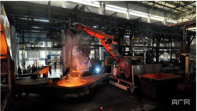 包头铝业电解一厂铸造车间捞渣机器人正在炉口作业(央广网记者 杨亚东 摄)