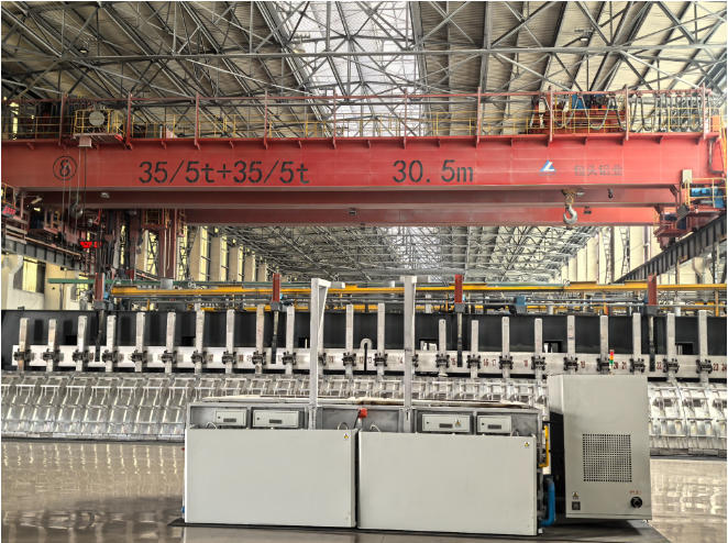 自动天车会远程精准完成电解车间阳极更换和残极搬运(央广网记者 邵玉琴 摄)