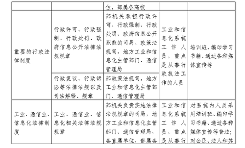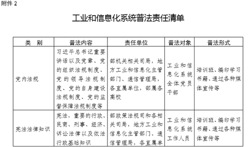 (一)建立健全普法责任清单。各单位要把普法工作作为推进法治建设的一项基础性工作,与其他业务工作同步部署、同步检查、同步落实。对照工业和信息化系统普法责任清单,制定本单位具体的普法责任清单,明确普法任务、宣传内容、普法形式、普法对象等。