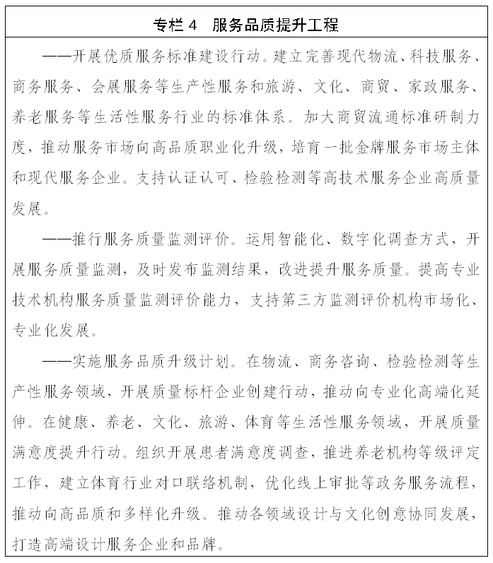 (七)提升产业质量竞争能力。推进能源、化工、装备制造、冶金、农畜产品加工等传统产业数字化升级改造,提高质量管理数字化水平。推动产业质量升级,围绕产业链整体质量水平提升强化上下游企业全面质量管理,增强关键环节、关键领域质量管控力和质量优势。开展对标达标提升行动,助推传统产业转型升级。开展农牧业生产“三品一标”提升行动,推进品种培优、品质提升、品牌打造和标准化生产提升行动,有效提高农牧业质量效益。引导企业开展有机产品等高端认证。推进传统制造业质量升级、技术迭代和协同创新,加快培育生物技术、机器人及人工智能等竞争型产业,推动制造业向高端化、智能化、绿色化转型,大力发展服务型制造。加快培育服务业新业态新模式,支持发展现代金融、旅游康养、文化娱乐、平台经济等新模式,鼓励金融机构开发知识产权、仓单和股权质押等金融产品和服务。加大文旅、养老等服务业质量标准制修订力度,开展服务业质量满意度调查,以问题为导向推动服务质量改进升级,优化服务业市场环境。推动现代服务业与先进制造业、现代农业融合发展,加快推进自治区物业服务市场监管与诚信一体化平台应用。
