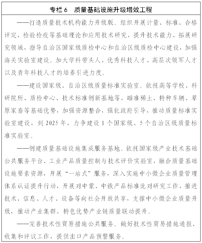 ——质量基础设施更加现代高效。质量基础设施更加完善、布局更加科学,实现更高水平协同发展,质量基础设施“一站式”实体服务窗口达到50个,建成国家产业计量中心2个,培育申建国家级质量标准实验室1个,建成自治区级质量标准实验室5个。