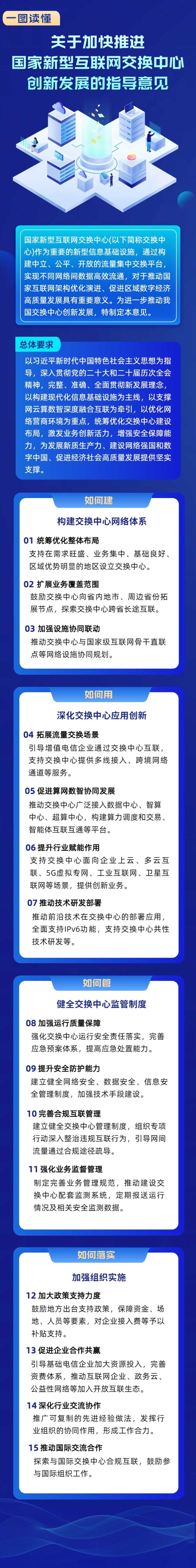《指导意见》明确以习近平新时代中国特色社会主义思想为指导,贯彻新发展理念,以构建现代化信息基础设施为主线,以支撑网云算数智深度融合互联为牵引,以优化网络营商环境为重点,统筹优化交换中心建设布局,激发业务创新活力,增强安全保障能力,为经济社会高质量发展提供坚实支撑。