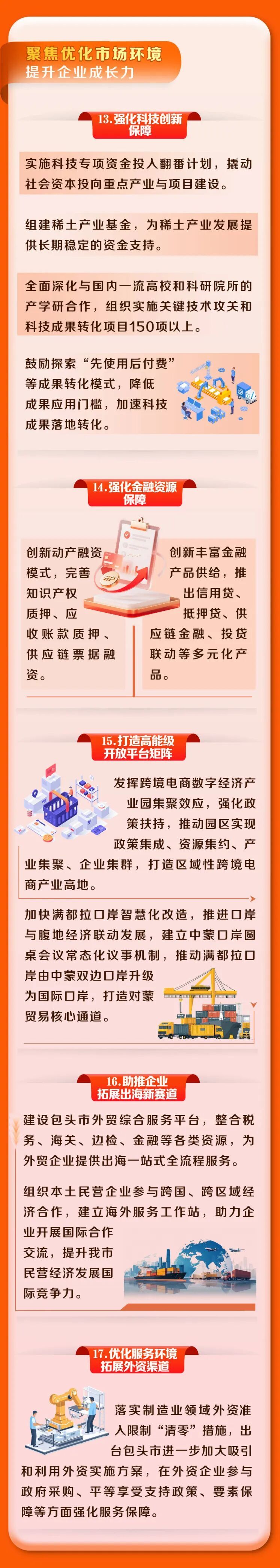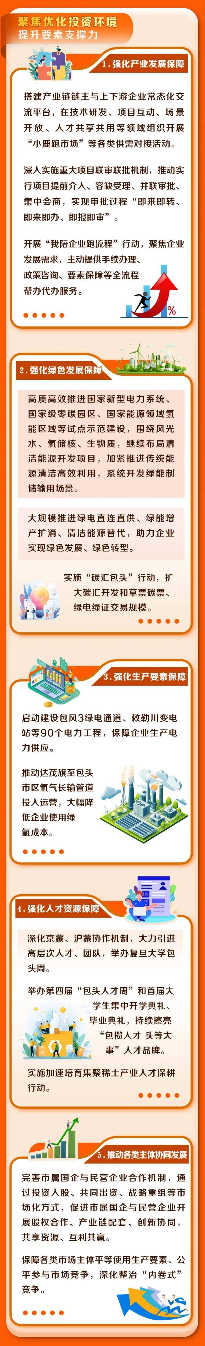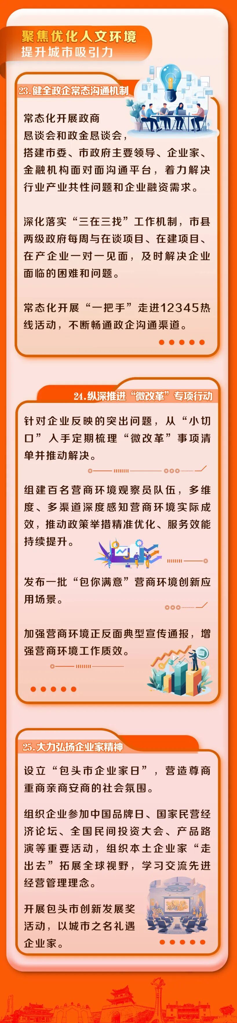 《方案》围绕建设“1144”现代化产业体系,全面贯彻落实自治区营商环境质量提升年工作要求,锚定“全区最优、全国一流”,立足“五聚焦”,制定营商环境25条,实现“五提升”,持续擦亮“包你满意、包你放心”营商环境品牌,全力推动包头高质量发展。