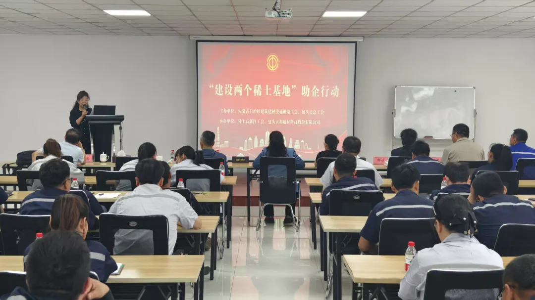 为深入贯彻习近平总书记“建设全国最大的稀土新材料基地和全球领先的稀土应用基地”指示要求,充分发挥包头市稀土产业链资源优势,充分发挥劳模和工匠人才的技术优势与专业特长,助力企业高质量发展。5月27日上午,由内蒙古自治区建筑建材交通机冶工会、包头市总工会主办的“建设两个稀土基地”助企行动在天和磁材公司召开。
